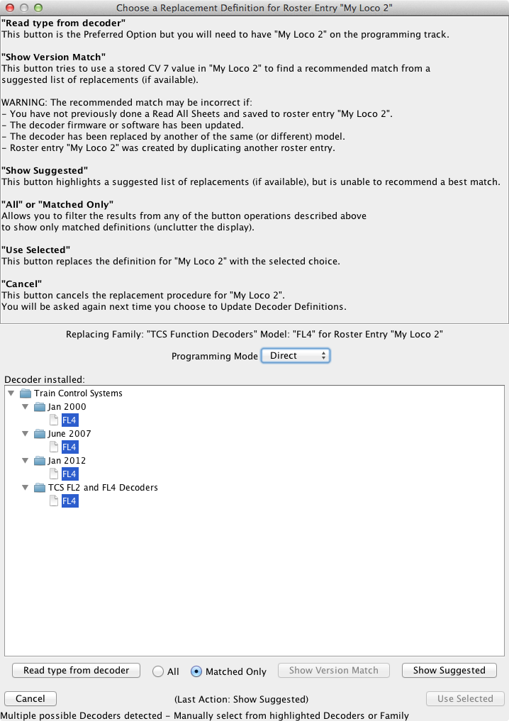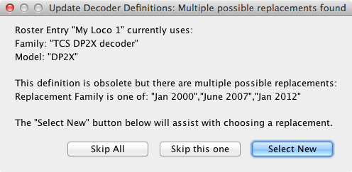 Note that an update defined this way is unconditional; if the family and model attributes match a roster entry, it will be updated to the new family/model. Automated conditional updates based on versionID or productID are not possible as these values are not stored in the roster entry. An interactive update process is now available in these cases and uses a special syntax: Since JMRI 4.9.5