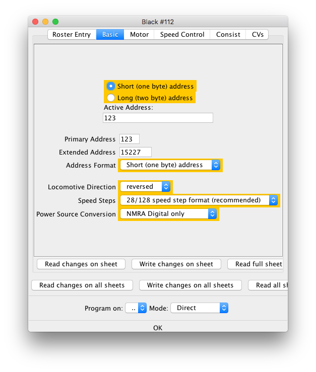 It is also possible to program the CVs directly using the CV Programmer. The "Read" and "Write" buttons allow you to work with individual CV contents. Changes made here will also update any associated values found on other programmer tabs.