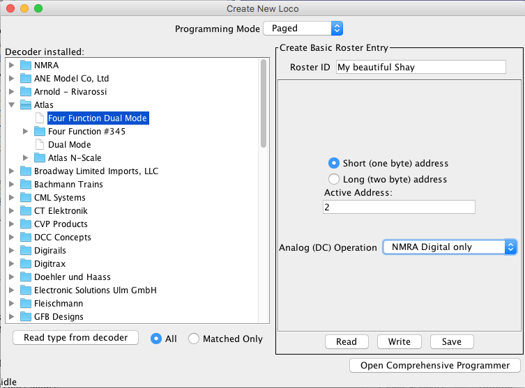 You'll get a new window to configure the programmer with information about a specific type of decoder, or an existing locomotive. This will become your locomotive roster as you program your decoders