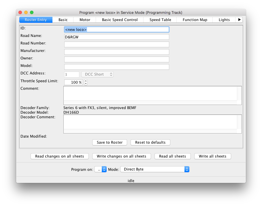 From the DecoderPro main screen, you can select a specific locomotive to work on by selecting it from the Roster list and then clicking the "Program..." button. The programmer opens with the current values already present on the "Roster Entry" sheet. After you made changes and wrote them to the decoder, click "Save to Roster" to store the roster information to a file on your computer's local disk; you'll be reminded to do this if you close the programmer with any unstored information.