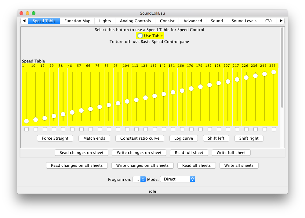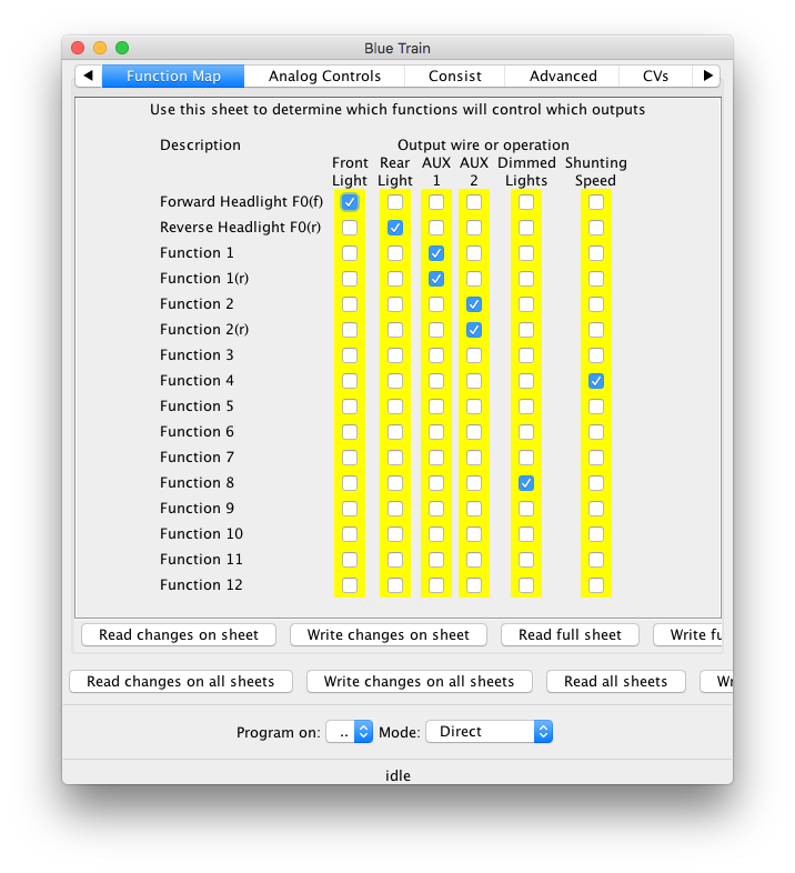 Although having a name for an entire CV is nice, where this really helps is with complicated bit-mapped options. Digitrax FX lighting options, for example, require configuring two sets of bits into one CV. Another example is configuring a Soundtraxx decoder's mapping between functions and sounds. This involves bits and values spread across a dozen different CVs, but DecoderPro turns that configuration job into simple checking of boxes.