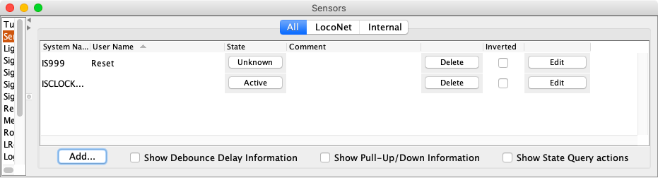 Note: The Reset sensor is Internal because it is not physically on the layout. It is used for internal JMRI purposes. It could easily be a physical push button on the layout. Then the system name would be LS999.