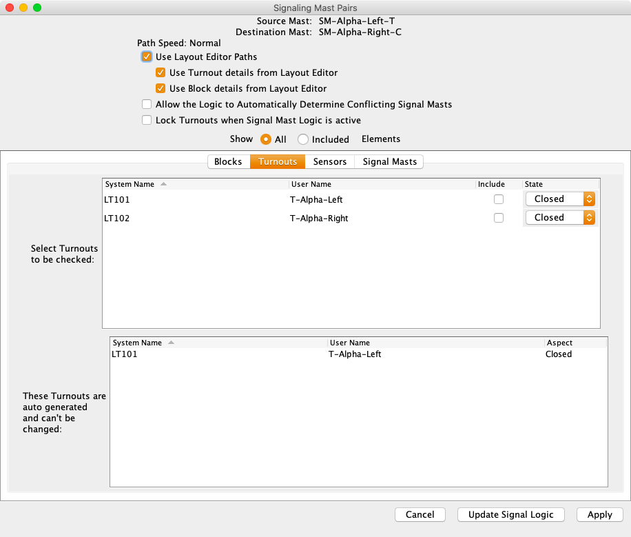 The next two images show the Block and Turnout tabs for the SML. The automatic sections were generated by the discovery process. The manual sections can be used to override automatic entries or add additional entries. If use Layout Editor Paths is turned off, then manual logic can be created. This might be needed for special cases.