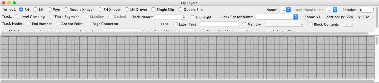 When PanelPro Panels ⇒ New Panel ⇒ Layout Editor is selected, a blank panel will be created with a default name. The panel will fill the screen, it will have a grid and at the top will be the Layout Editor tool bar.