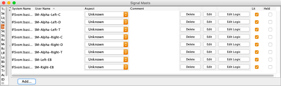While it is possible to use the Add button to create each set of signal mast logic, use the Tools ⇒ Auto Generate Signaling Pairs menu item. This will discover all the signal mast pairs and build the signal mast logic definitions.