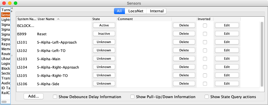 Note: The Reset sensor is Internal because it is not physically on the layout. It is used for internal JMRI purposes. It could easily be a physical push button on the layout. Then the system name would be LS999.