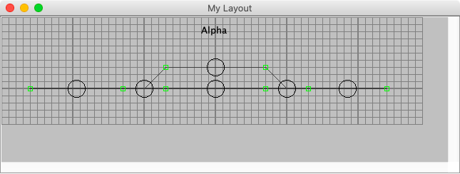 Clean up the track plan by moving components to the grid. The snap to grid settings for adding and moving items can be set using Layout Editor Options ⇒ Grid Options. The diverging legs of the turnouts have been extended at a 45° angle. A label has been added to provide a name for the siding. Everything on the prototype has a name.