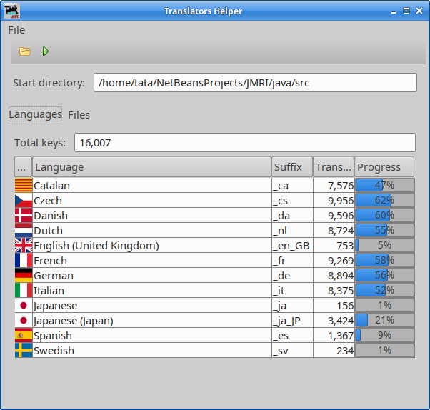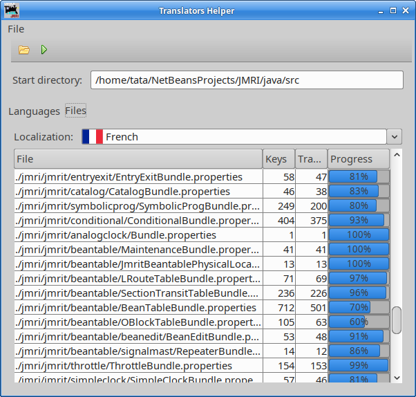 In the Files tab it is possible to select a specific language. The table below the selection shows all found .properties files and the number of translated keys.