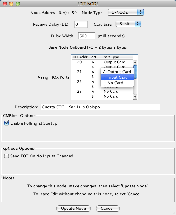 The Edit Node window will open and display the configuration for the selected node. The node address cannot be modified. Make the necessary changes, then click on the Update Node button. If there are any data entry errors, an error message will be shown in the "Notes" section of the window. When you are done editing, click on the Done button to close the window.