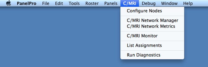 The C/MRI menu contains three tools which are used to manage nodes in a CMRInet network. Controlling the polling of nodes, displaying the operational states of configured nodes, and monitoring the data message traffic on the network are all functions available in the tool suite.