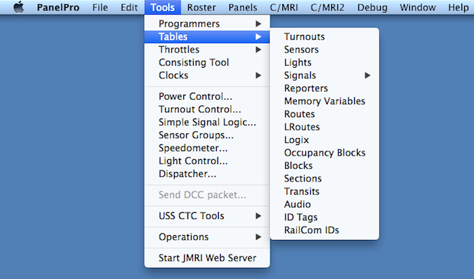 JMRI refers to C/MRI Input bits as Sensors and Output bits as Turnouts or Lights. The definition of Sensors, Turnouts, and Lights is done by adding entries into the appropriate data table. Tables are accessed by selecting from the PanelPro main screen Tools⇒Tables⇒{table name}