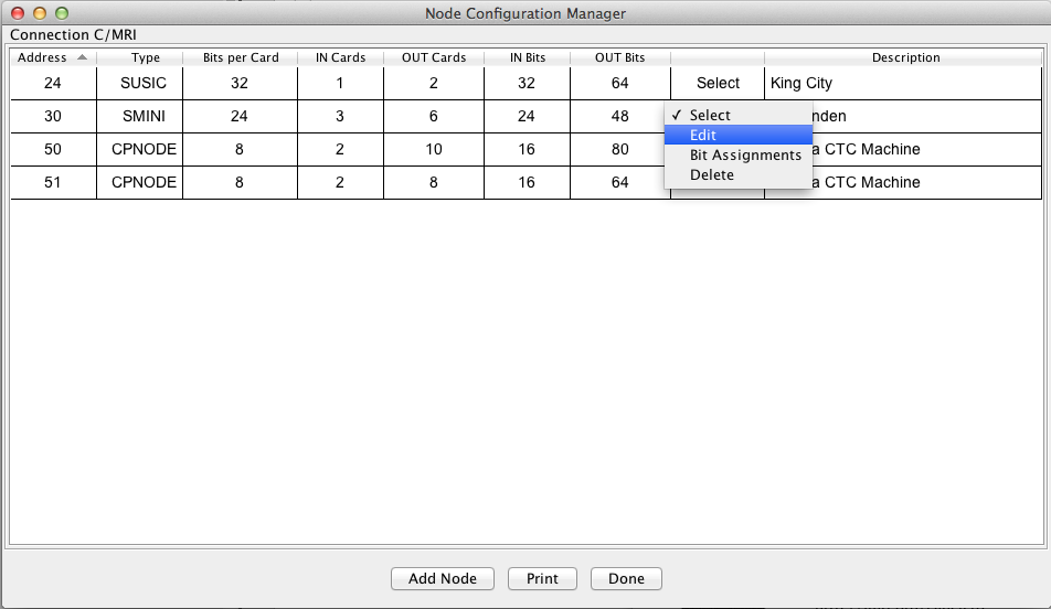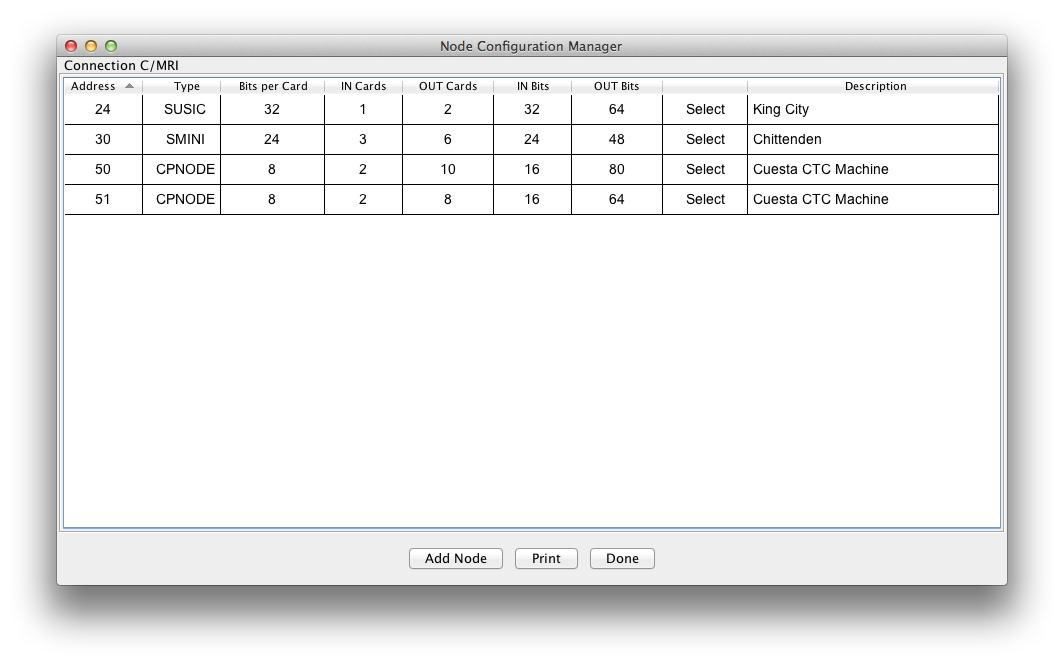 Any existing C/MRI nodes will be displayed by node address. The serial connection name is displayed with additional configuration information for the node. Clicking on any of the column titles will sort the rows in alphanumeric order.