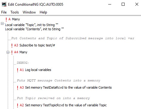 In the picture below, you can set up LogixNG conditionals to subscribe to any messages coming from any devices on the layout (in this case with topic "test/" followed by anything else; "#" is the wild card character). Note that for Subscribe, LogixNG requires you to specify the topic directly in the conditional expression (it cannot be, for example, in a memory as in the case of Publish). JMRI will put the topic and contents of the message into LogixNG local variables (Topic and Contents) and you can then use them or, as in this example, move them into JMRI memories (TestDataRcvd and TextTopicRcvd) for further use.