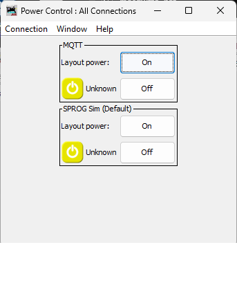 If you select an MQTT connection as the default for Power Control, MQTT messages will be published when selecting Power ON or OFF from the Power Control Window, the WiThrottle Server window, or any throttle connected via the WiThrottle Server, or any scripts that use "powermanager.setPower(jmri.PpwerManager)". [If multiple command stations types are connecte to JMRI, it is always possible to turn their track power on or off via the Power Control Window.]