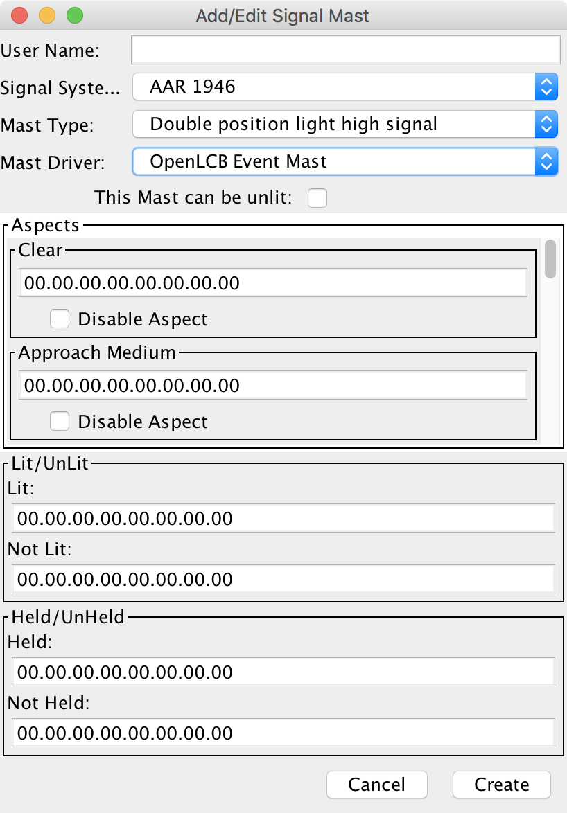 - A scrolling set of aspects to configure: For each one, enter the OpenLCB EventID that