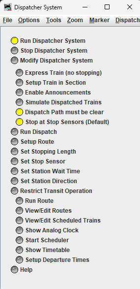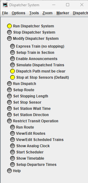 - Setup a Route and run the route. A Route consists of a path joining several stations. The stations joined can be anywhere on the layout no matter how far apart they are, and the system will find valid paths between the stations. The station buttons can be used to either set up a dispatch or set up a route depending upon whether "Setup Route or "Run Dispatch" is selected. The route is run by pressing the "Run Route" button.