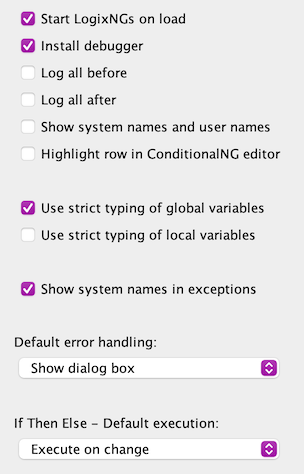 LogixNG has robust error handling. The combo box selection provides the default setting. Individual expressions and actions can override the default setting. For details, see Error Handling