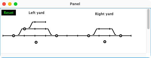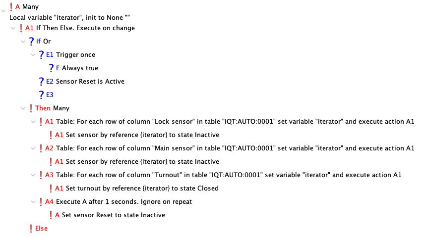 An initialization LogixNG is used to set the initial sensor and turnout states. This LogixNG is also triggered by the Reset sensor.