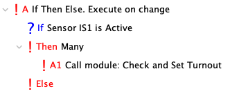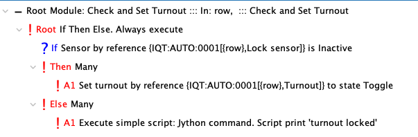 Each turnout has a ConditionalNG that is triggered when the toggle sensor changes state. If the sensor goes Active, a module is called to check the lock state and toggle the turnout. A variable is passed to the module that has the row number.