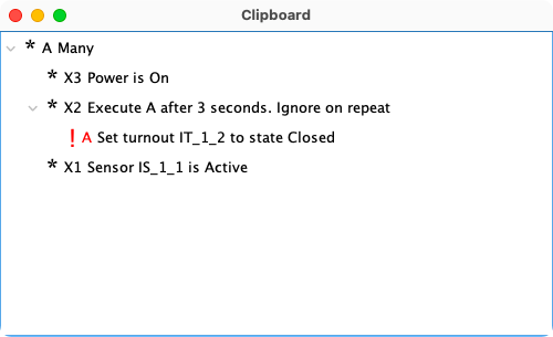 While editing a ConditionalNG, it can be useful to cut out something, edit something else, and then paste it back. Chapter 1 has a good example. For this purpose, LogixNG has a clipboard. Each time you cut an action or expression, it is moved to the clipboard.