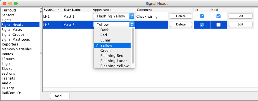 Once a Signal Head has been defined, its connection Type and System Name can't be changed. You can ignore Signal Heads that you've defined and don't use; they don't hurt anything. If preferred you can delete a Signal Head from the Signal Head Table by clicking the Delete button. Save a copy of the JMRI Configuration file as a backup first and carefully read the warning message that pops up if the Signal Head is used by other parts of JMRI!