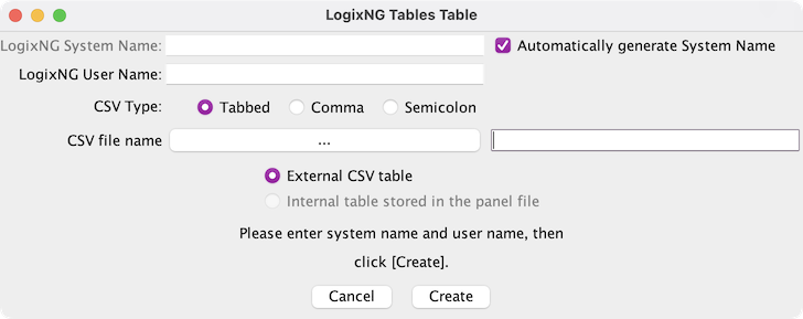 The user name is optional but recommended. A user name may be any useful text, provided the new user name was not previously assigned to another LogixNG Table. Once a LogixNG Table is created, its system name cannot be changed. Its user name may be changed in the LogixNG Tables Table. The user name is usually used to provide a more descriptive name, for example, "Signal 5 Table".