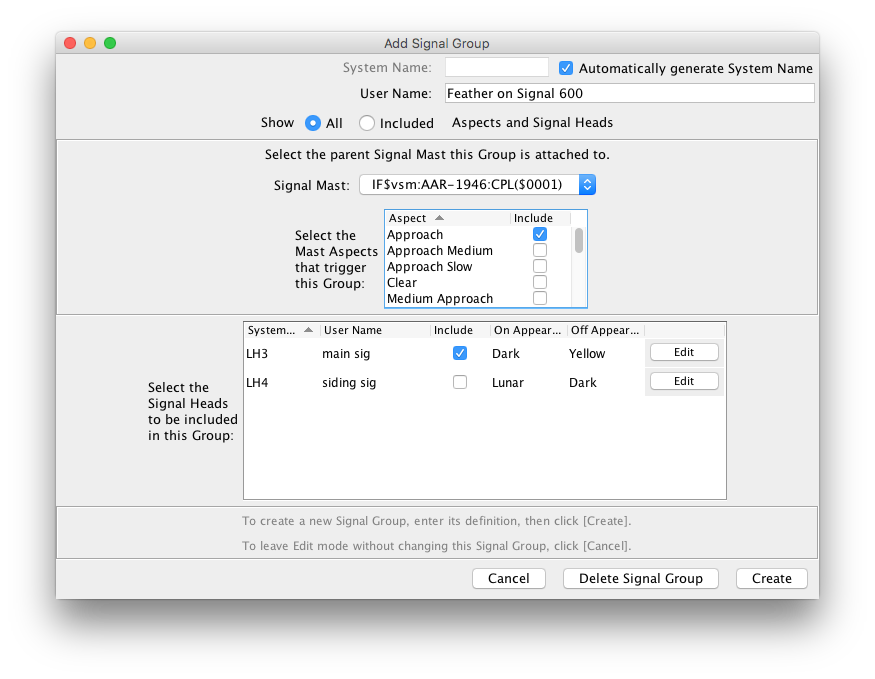Signal Groups are built from one or more Signal Heads and comprise the following: