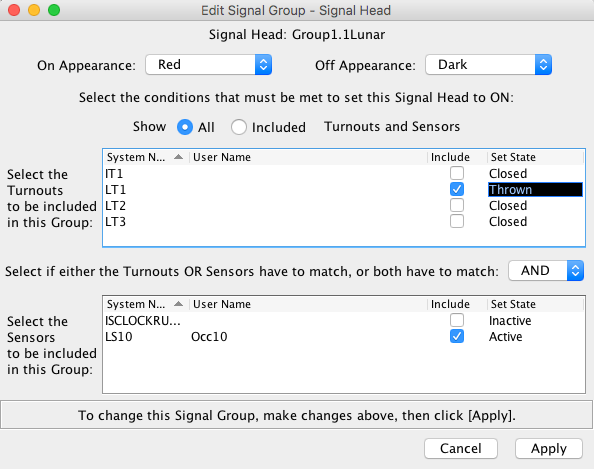 Each Signal Head that you include in Signal Group has a set of criteria that have to be met before that Signal Head is illuminated. These criteria are made up from Turnout and/or Sensor states and can be changed by clicking on the corresponding Edit button in the last column of the Add/Edit Signal Group pane. A new pane like the one shown to the right will open, letting you define a specific Signal Head that is part of your Indicator.