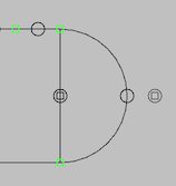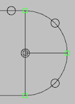 7. To connect this turnout with the upper passing track and form a simple oval track diagram, select Anchor Point on the third row of the tool bar. An Anchor Point is a node in a track diagram that can accept two connecting track segments; it's used to place connected track segments so that they look reasonably nice (and also to divide blocks). While holding shift down, click on a point exactly to the left of the turnout on your upper left, and again on a point directly below this one, but exactly to the left of the lower turnout. Next click on a point about 1/2 inch to the left and 1/2 inch below the upper anchor point, and again on a point 1/2 inch to the left and 1/2 inch above the lower anchor point. You should now have four anchor points outlining the left side of the oval. Connect these four points and the turnout throat connection points with track segments--select Track Segment, then with shift pressed, click and drag to create each of the five track segments needed. Note that the anchor point rectangle will change from red to green when it has two connections. Similarly repeat this procedure to draw the right side of the oval.