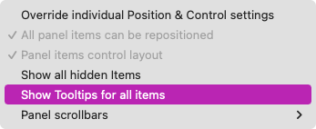Note: Changing the panel option for showing tooltips results in setting every panel item to show or not show its tooltip.