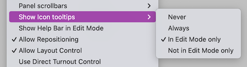 The icon context menu (right click) has an entry for Tooltips with 3 menu items. Note: The Layout Editor turnout and slip context menus do not have a tooltips sub menu even though they show tooltips as of JMRI 5.3.6.