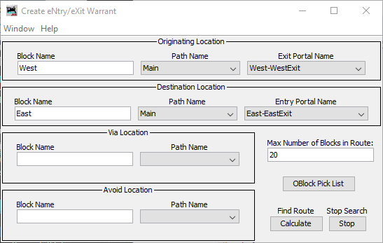 Blocks are chosen either by typing in the block name or dragging it from a displayed OBlock table (use the OBlock Pick List button). The origin and destination blocks can also be chosen by clicking on track icons that represent these OBlocks. To use this feature your panel must have your layout depicted by Indicator Track Icons placed there by Circuit Builder.
