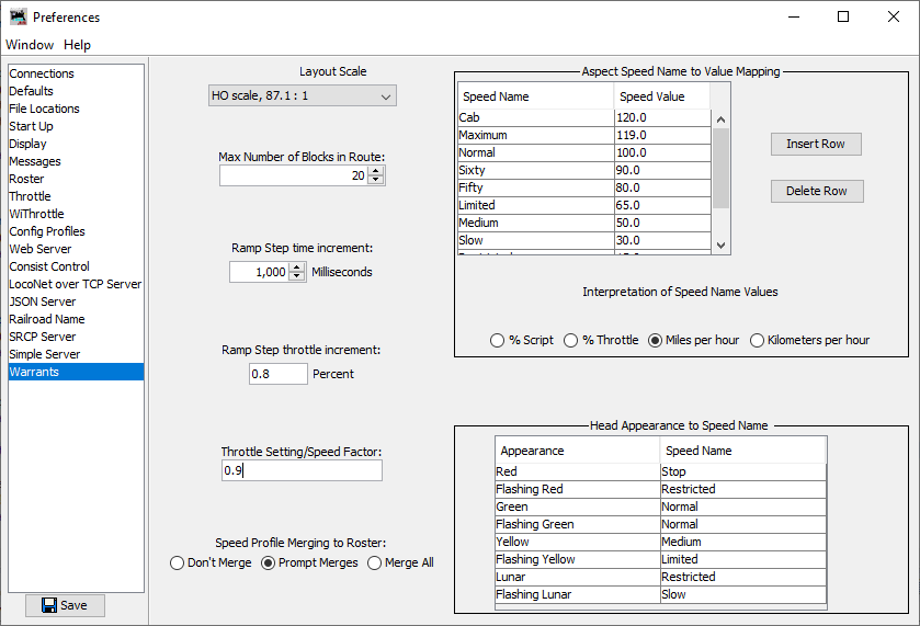 The View Speed Profile button displays a table of the track speeds that will be used in the calculations for the Warrant. The table is comprised of the Roster Speed Profile merged with any speed measurements that have been made during the current session. If the table is empty, the values for Throttle Factor and Layout Scale in Warrant Preferences are used in the calculations. (Note, this was the only way it was done prior to Release 4.9.2.)
