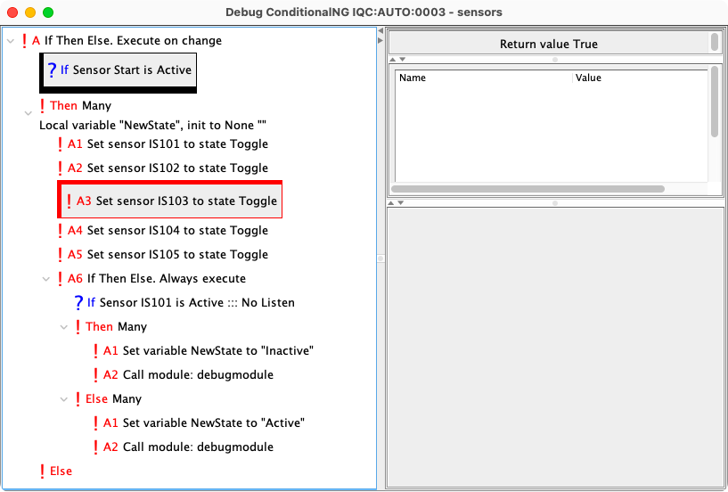 Sometimes it can be difficult to understand exactly what's going on in a ConditionalNG. LogixNG therefore has a debugger that allows a step by step walk thru a ConditionalNG to see what it's actually doing.