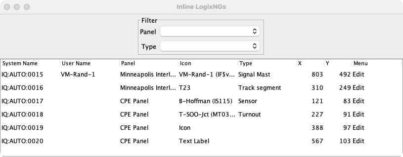The Edit column provides direct access to the LogixNG and an option to Delete the Inline LogixNG.