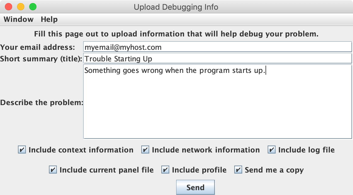 The "Upload Debugging Information" help item will open a new window with three fields and six checkboxes. Enter your email address in the top line. It won't be made visible to the public, but we do require a valid email address to cut down on spam. In the next field, enter a one-line summary of the problem that will appear as the subject of the upload. Finally, type a few lines describing want went wrong, how to recreate it, etc.