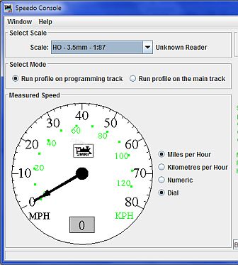 Add both the DCC system and the reader interface as layout connections in the JMRI preferences. Open the Speedo console from the Speedo menu on the main screen of DecoderPro or PanelPro.