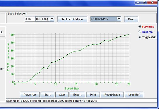 Speed Profile Chart: The radio buttons to the right of the chart allow you to select whether you want a profile for the locomotive running forward, or backwards, or both. The grid lines on the chart can be toggled off and on as well.