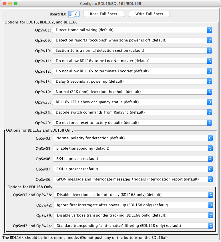 When performing a "Write Full Sheet" operation to a BDL16 or BDL162 device, this tool will write all of the OpSw values, not just the OpSw values which are defined for the BDL16 or BDL162 device. This is thought to be safe, as it is thought that these OpSw values will be ignored by the hardware. If you are concerned that this may not be acceptable, then select the "default" value for the OpSw values which do not apply to the board type which you are configuring.