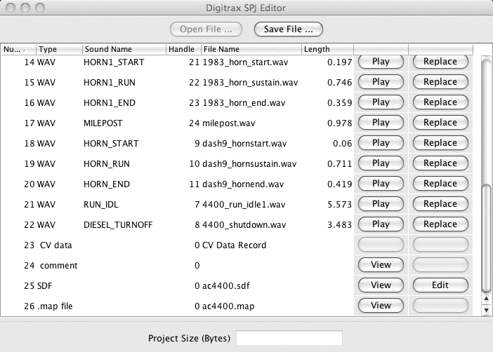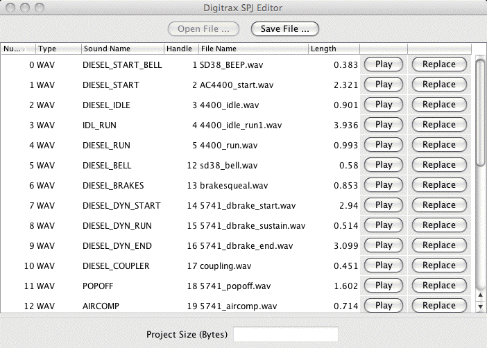 The "Digitrax SPJ Editor" window allows you to examine and change the contents of a sound project file. Once you've changed them, you can install them into your decoder with the sound downloader.
