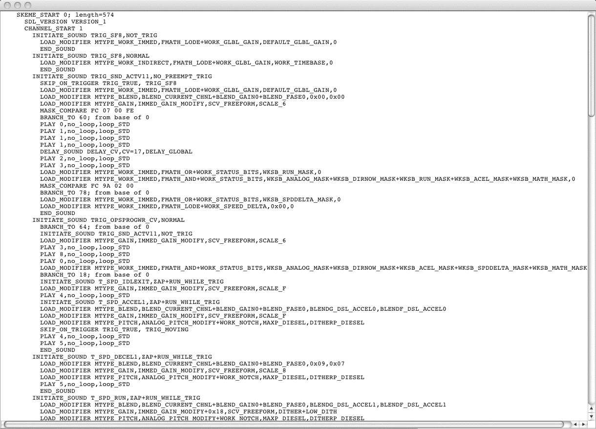 Digitrax sound decoders are loaded with "sound projects", stored in "Sound Project" (.spj) files. Those contain a number of "sound fragments" in .wav format, plus a small program that tells the decoder when to play the various sounds, and controls the use of functions and CVs. That program is stored in a "Sound Definition" (SDF) format.